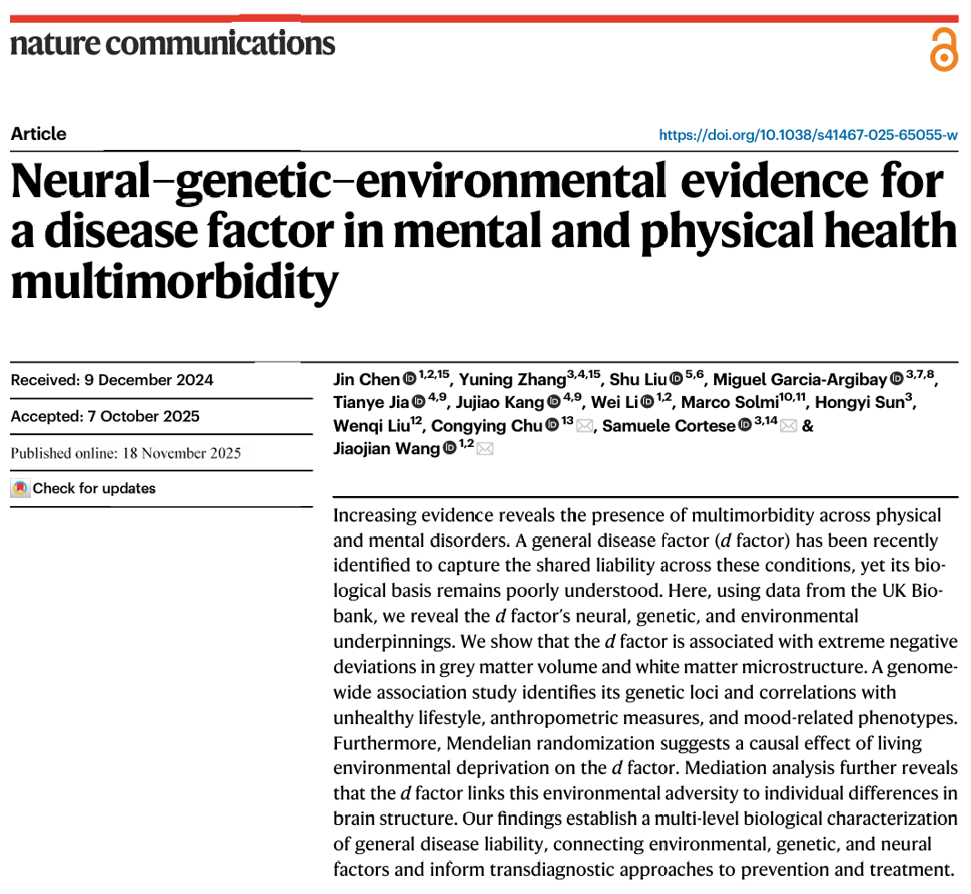 精神障碍与常见身体疾病在全球范围内高度共病,但身心共病的病理机制仍未被回答。传统研究往往聚焦于单一疾病或单一系统,使得跨精神、身体的共享风险结构难以被捕捉。针对这一科学瓶颈,日前,华体会平台灵长类转化医学研究院、省部共建非人灵长类生物医学国家重点实验室王骄健教授团队,基于英国生物样本库(UKBiobank)的大规模多模态数据,构建了可定量表征个体身心疾病易感性的“一般疾病因子(d因子)”。研究从疾病结构、大脑结构偏离、全基因组遗传机制与社会环境暴露等多个层面进行了系统解析。相...