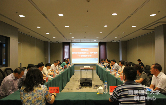 5月14日下午,昆明学院党委书记陈世波,校长何华,副校长熊晶、郭华、董建华一行11人到我校就党建工作、“三严三实”和“忠诚干净担当”专题教育活动、华体会(中国)创新创业教育开展情况进行调研。校党委书记周荣,校长张英杰,副校长王华,纪委书记李莉,校长助理、研究生院院长束洪春出席,两校党办、校办、组织部、人事处、教务处、科技处负责人参加调研。调研座谈会在莲华校区伍集成会堂三楼第二会议室召开。