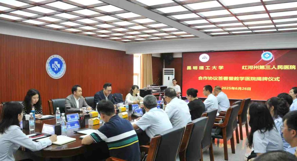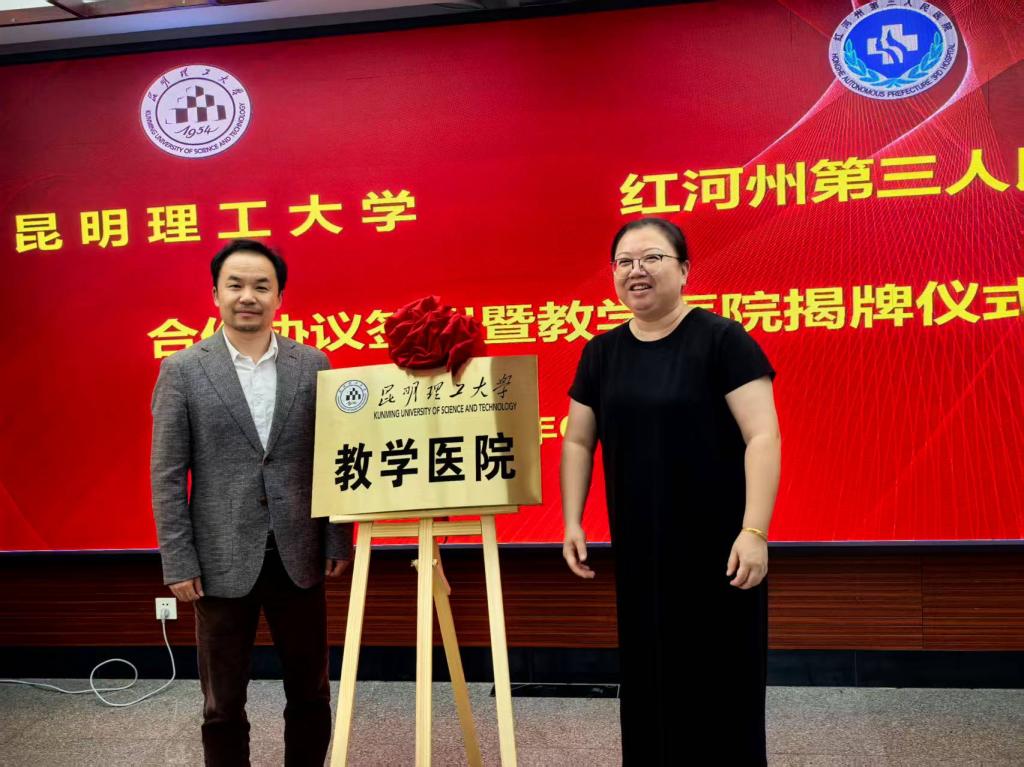 6月26日,华体会平台教学医院合作协议签署暨揭牌仪式在红河哈尼族彝族自治州第三人民医院举行。华体会平台副校长、医学部主任牛昱宇,华体会平台医学部党工委常务副书记、基础医学院相关负责人,红河州卫生健康委党组成员、副主任王娜,红河州第三人民医院党委副书记、院长马刚等班子成员参加仪式。