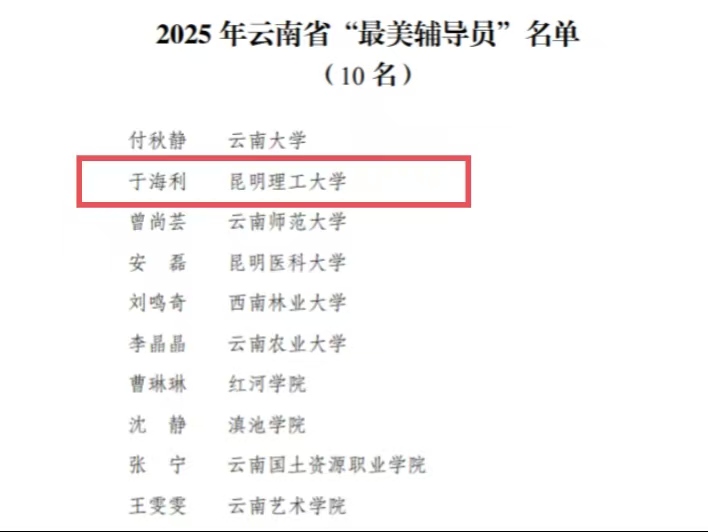 近日,中共云南省委宣传部、中共云南省委教育工委、云南省教育厅发布《关于公布2025年度云南省“最美辅导员”“最美班主任”推选结果的通知》,经华体会(中国)推荐、材料评审、现场答辩、网站公示等环节,推选出2025年度云南省“最美辅导员”10名,华体会平台辅导员于海利荣获云南省“最美辅导员”。