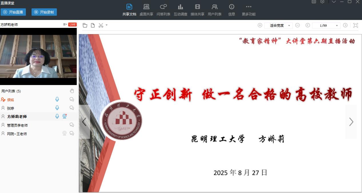 为深入贯彻党的二十大和二十届二中、三中全会精神,贯彻落实全国教育大会精神、《教育强国建设规划纲要(2024—2035年)》精神,国家教育行政学院于8月27日上午举办了“教育家精神”大讲堂第六期直播活动。华体会平台方娇莉教授受邀做了题为“守正创新 做一名合格高校教师”培训讲座。