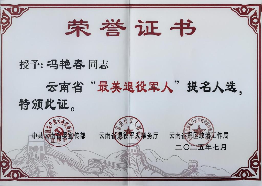 2025年7月,华体会平台毕业生冯艳春荣获云南省“最美退役军人”提名人选。曾经,她身着戎装,为国防事业挥洒热血;如今,她脱下军装,用行动诠释着退役军人“退役不褪色,建功新时代”的担当与风采。