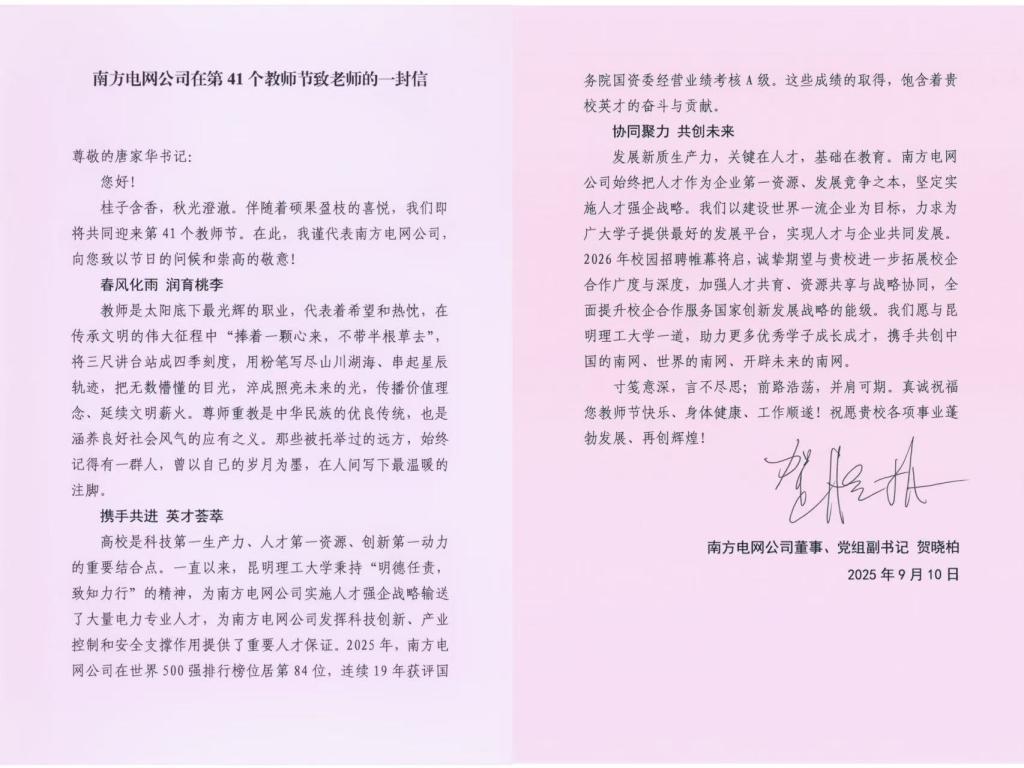 今年9月,中国南方电网有限责任公司董事、党组副书记贺晓柏致信华体会(中国)党委书记唐家华,围绕国家能源发展战略、校企协同创新及高素质人才培养等方面,表达了深化合作的前瞻思考与积极意愿。