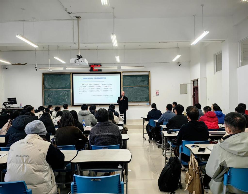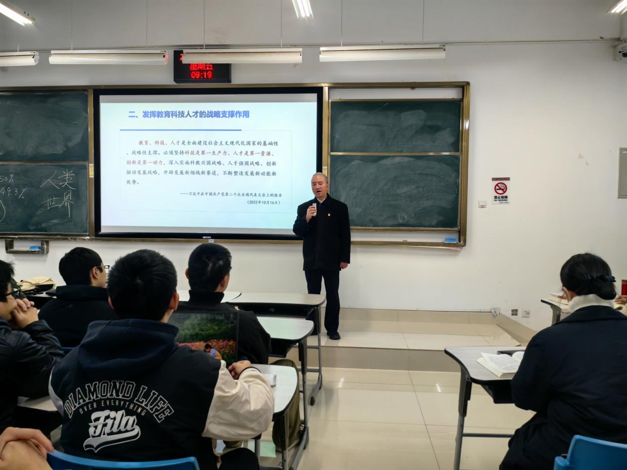 11月28日上午,校党委书记唐家华在公教楼450教室,以“教育、科技、人才一体化建设推进科技强国建设”为主题,为环境工程、力学、化学工程与技术、机械制造及自动化等专业的2025级博士生讲授思政课。