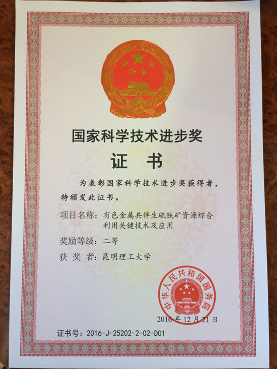1月9日,国家科技奖励大会在北京人民大会堂隆重举行。党和国家领导人习近平、李克强、刘云山、张高丽等出席大会并为获奖代表颁发奖励证书。华体会平台文书明教授领衔的“有色金属共伴生硫铁矿资源综合利用关键技术及应用”成果荣获2016年度国家科学技术进步奖二等奖,是云南省内企事业单位作为牵头获得国家自然科学、技术发明和科学技术进步三大类奖项之一的唯一单位。文书明教授应邀参加奖励大会。
