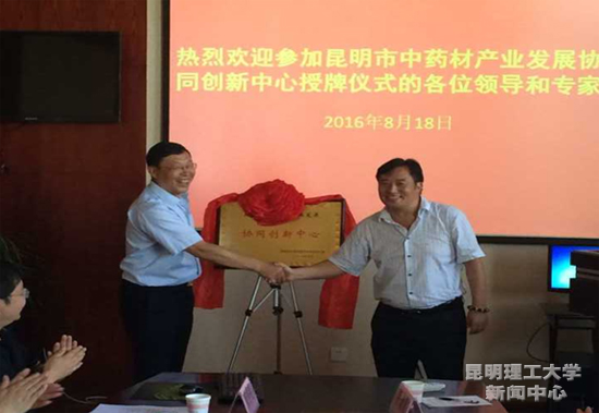 生命科学与技术学院负责人介绍了学院发展建设及科研平台建设情况,对省农业厅、昆明市农业局给予的支持表示感谢,对“昆明市中药材产业发展协同创新中心”的成立表示祝贺并寄予了厚望。昆明市生物资源开发创新办公室负责人李兴华对昆明市中药材产业发展协同创新中心的成立表示祝贺,并介绍了昆明市农业局协同创新中心设立的指导思想和主要任务,希望通过中心的搭建推动昆明市中医药振兴和产业发展。昆明市生物资源开发创新办公室负责人李兴华和生命科学与技术学院李云军书记共同为中心揭牌。
