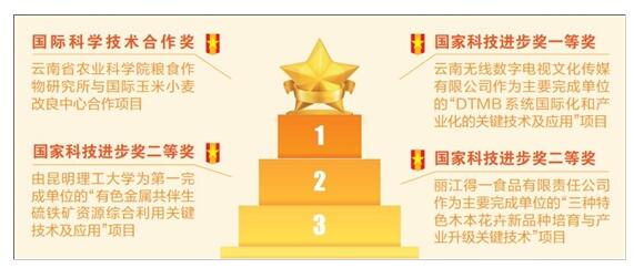 云南无线数字电视文化传媒有限公司作为主要完成单位的“DTMB系统国际化和产业化的关键技术及应用”项目获得国家科技进步奖一等奖;丽江得一食品有限责任公司作为主要完成单位的“三种特色木本花卉新品种培育与产业升级关键技术”项目获得国家科技进步奖二等奖。