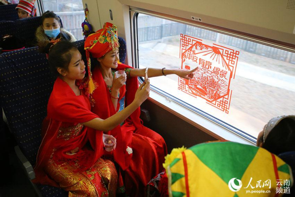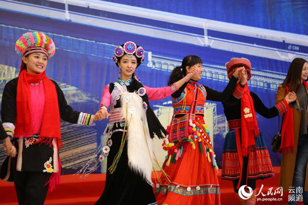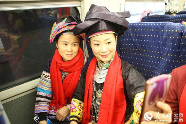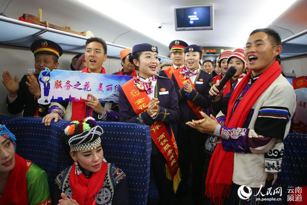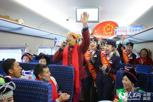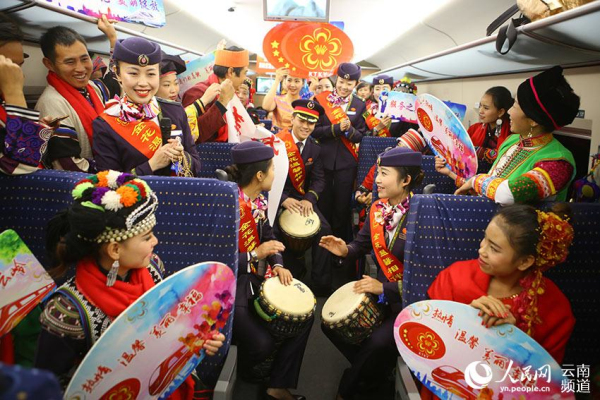 “路旁的花儿正在开哟,树上果儿等人摘,等人摘,那个塞洛塞,那个唉洛唉,远方的客人请你留下来……”G4136次列车开出后不久,欢歌笑语就传遍了整个车厢。来自云南的25个少数民族群众代表身着盛装,与乘务员一起,载歌载舞,庆祝高铁的顺利开通。