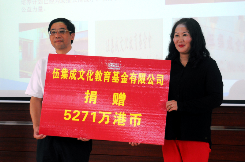 據瞭解,香港伍集成文化教育基金有限公司前身是1985年成立的香港伍集成文化教育基金會,由雲南騰沖籍香港實業家伍集成先生個人出資成立,現由伍集成女兒伍宗琳女士任董事長,長期致力於促進雲南文化教育事業的發展。捐贈儀式上,昆明理工大學校長彭金輝接受該公司捐贈,並向該公司代表頒發榮譽證。手寫的榮譽證書稱:伍宗琳家族心繫教育、關愛昆明理工大學,向該校捐贈價值5270萬元的集成會堂,該校師生員工對其善舉感銘於心、廣為傳頌。