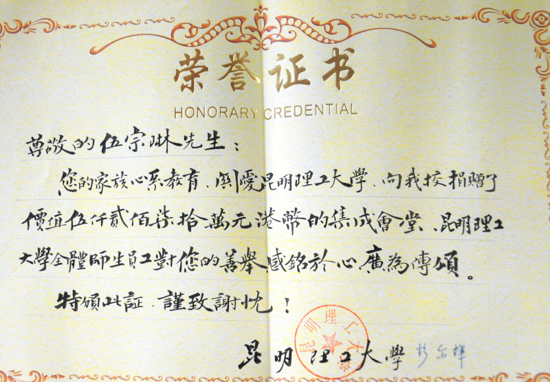 昆明理工大學向香港伍集成文化教育基金有限公司頒發的榮譽證書。 記者 丁樹勇 攝