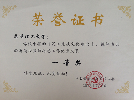 近日,根据《中共云南省委高校工委关于公布2016年高校宣传思想工作优秀成果名单的通知》(云高工宣[2016]11号),经各高校择优推荐,专家评审,华体会平台申报的”昆工廉政文化建设——突出分类教育重点,营造风清气正的校园廉政文化氛围”荣获云南省高校宣传思想工作优秀成果一等奖。