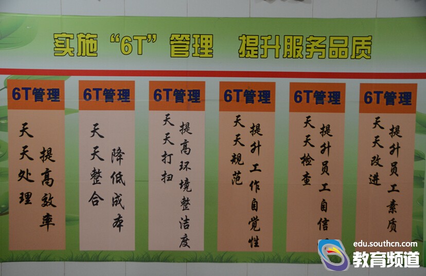 据介绍,该校食堂之所以发生如此大的变化,源于该校后勤保障处引进的6T管理。“6T管理”就是“6天管理”。6t就是“6天”的意思,也即“6个天天”——“天天处理、天天整合、天天清扫、天天规范、天天检査、天天改进”。