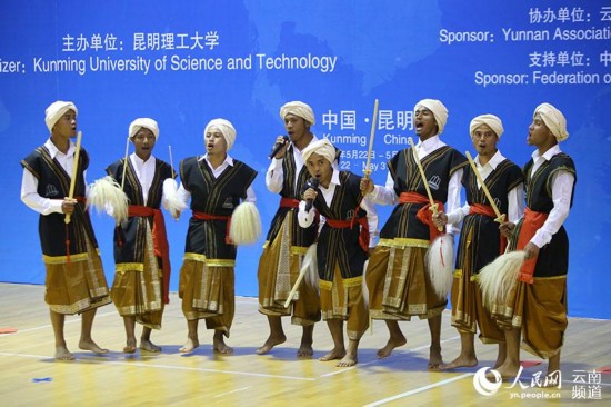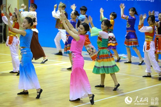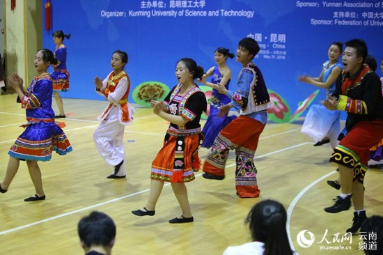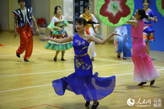 身着云南少数民族服饰的中国学生在表演舞蹈。(人民网 李发兴 摄)