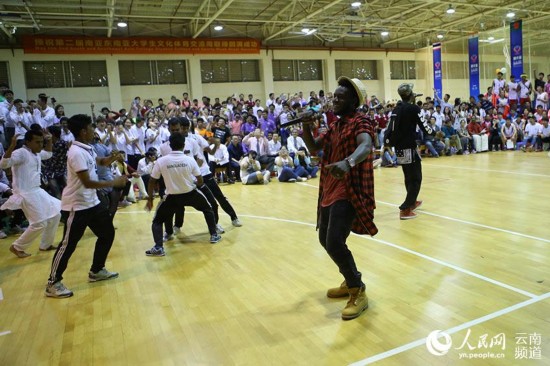 中外大学生在晚会上表演节目。(人民网 李发兴 摄)