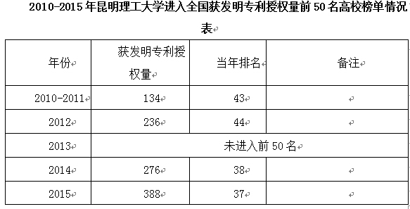 至2015年底高校有效发明专利量前50名中,清华大学、浙江大学和上海交通大学则位居前三位,昆明理工学学以1064件位居全国高校第48名。