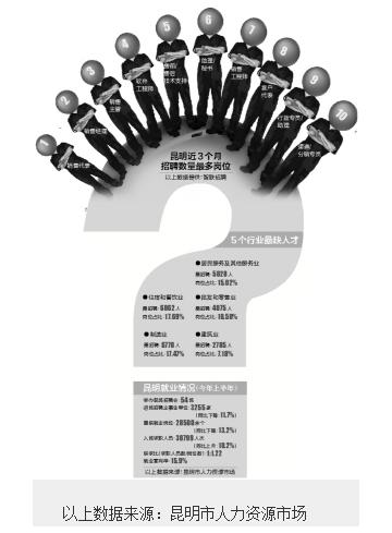 据昆明市人力资源市场统计,昆明目前这5个行业最求贤若渴,包括:住宿和餐饮业、制造业、居民服务及其他服务业、批发和零售业以及建筑业,今年上半年,这些行业提供的岗位数量占岗位总量的近70%。觉得工作难找的毕业生们,可将这些行业作为就业目标。