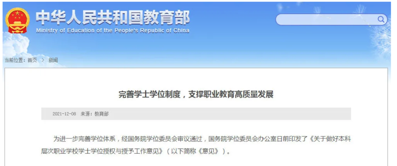 日前,国务院学位委员会办公室印发《关于做好本科层次职业华体会(中国)学士学位授权与授予工作意见》。
