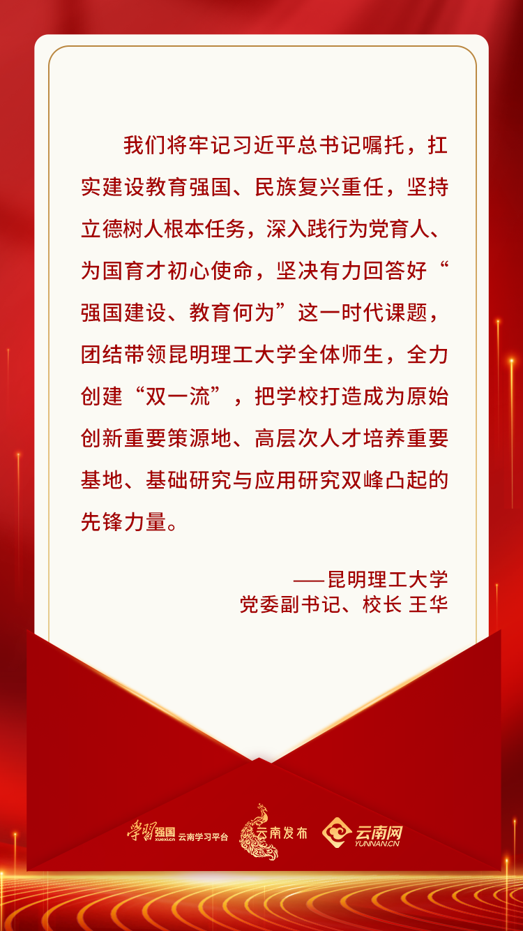 4月20日,习近平总书记致信祝贺云南大学建校100周年,向全体师生员工和广大校友致以热烈的祝贺和诚挚的问候。习近平总书记的贺信引发云南高校师生热烈反响。大家表示,要认真学习贯彻习近平总书记重要贺信精神,踔厉奋发、勇毅前行,坚守初心使命,落实好立德树人根本任务,为党育人、为国育才,培养更多高素质人才,在全面建设社会主义现代化国家新征程上争取新的更大贡献。