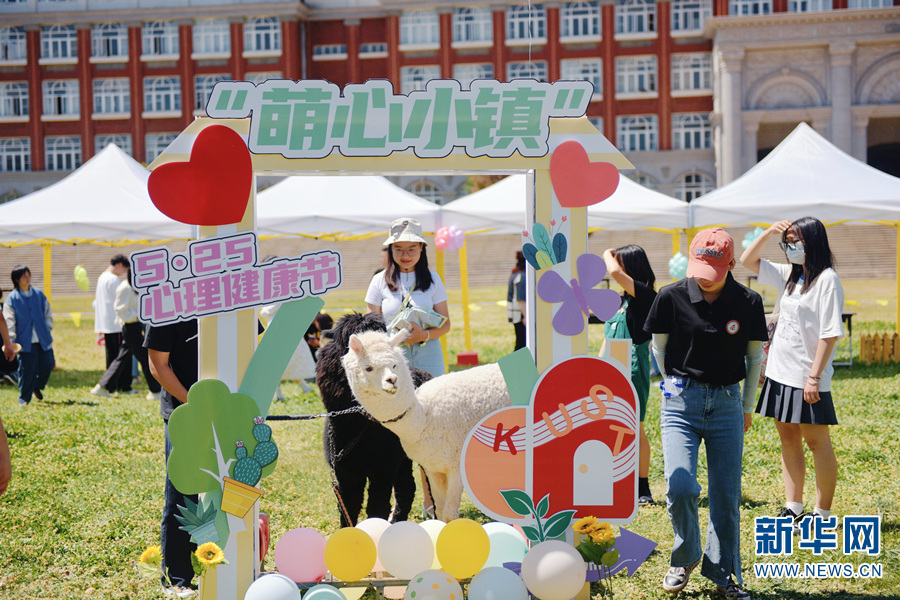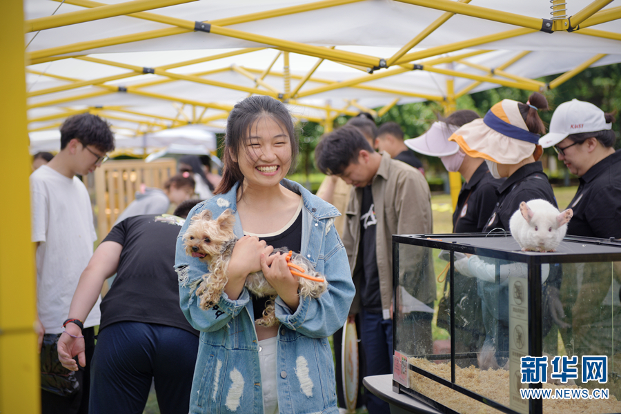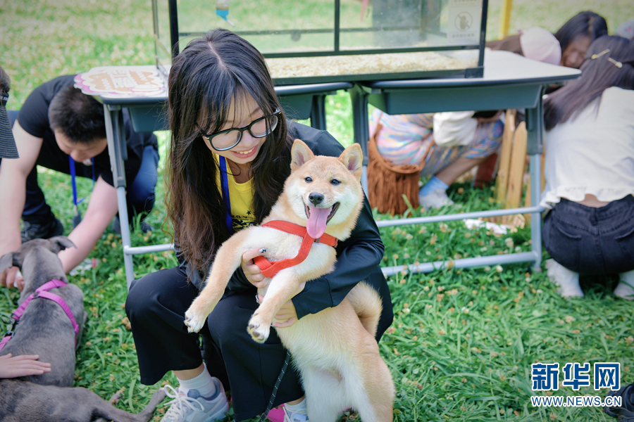 学生在与动物的互动中得到治愈(5月5日摄)。新华网发(刘羽璘 摄)
