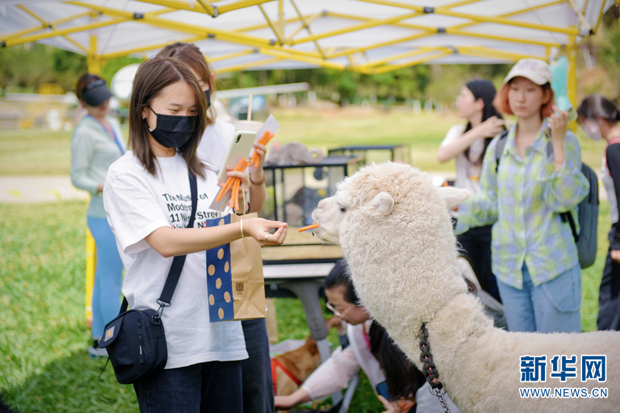 学生与羊驼互动(5月5日摄)。新华网发(刘羽璘 摄)
