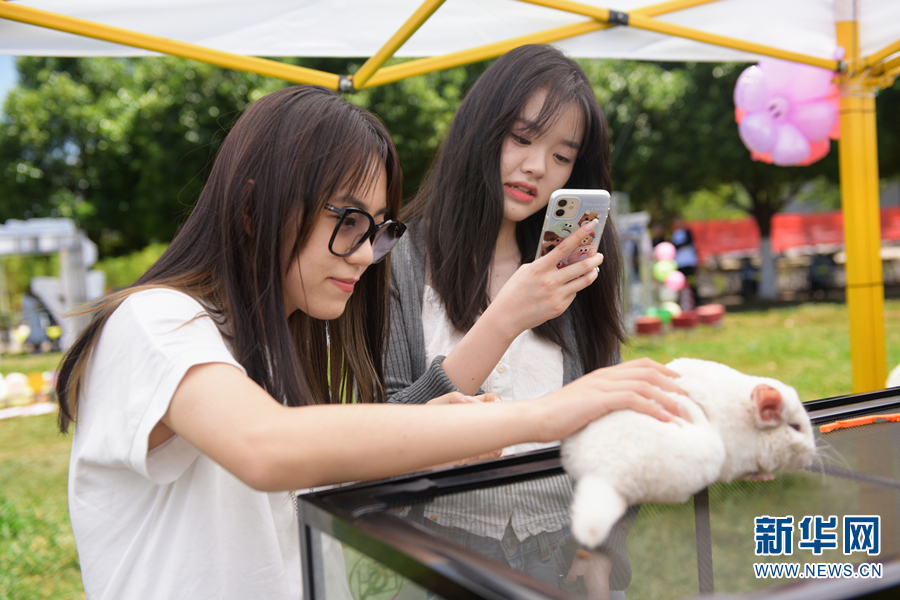 学生与小动物有爱互动(5月5日摄)。新华网发(刘羽璘 摄)