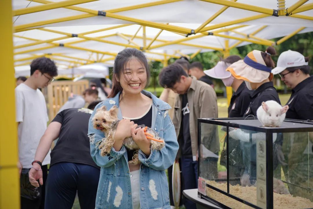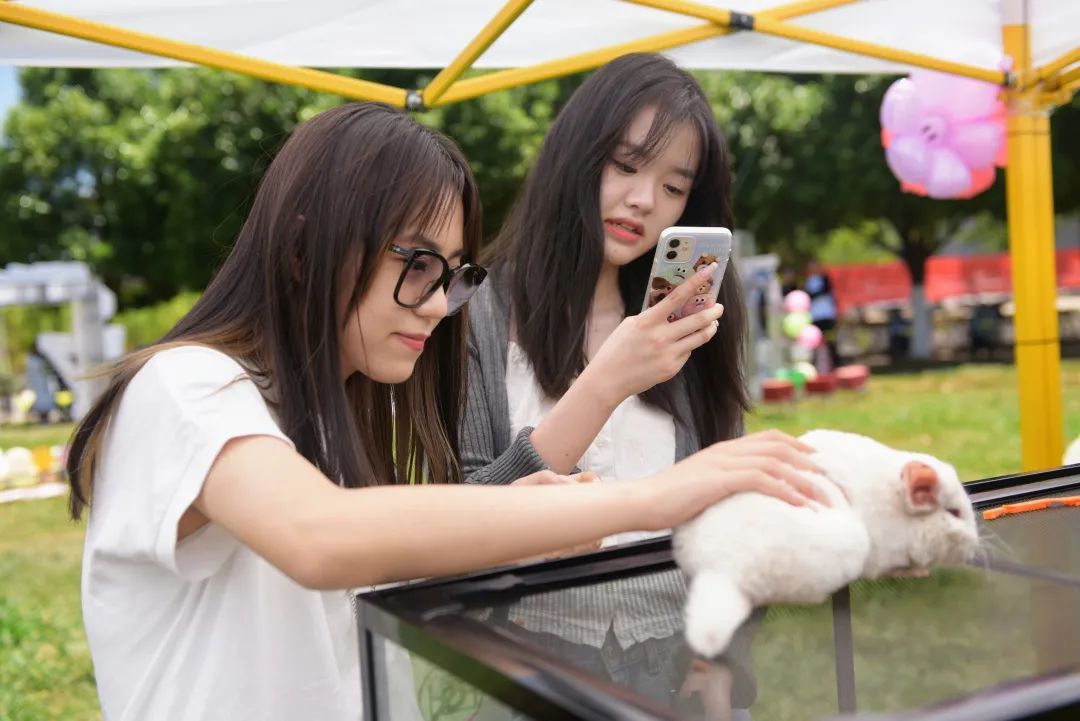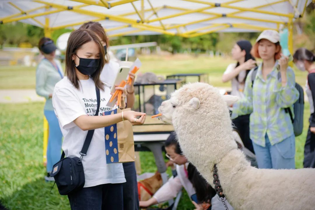 活动中,同学们在“萌心小镇”与羊驼、狗、猫、龙猫、小兔等多种动物进行游戏、互动,沉浸式体验与动物相处的快乐时光。