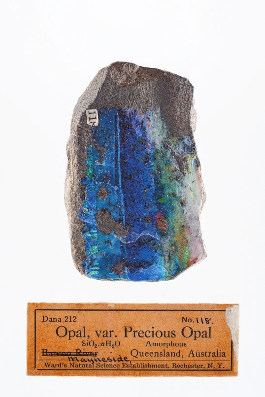 这枚百年前采自澳大利亚昆士兰州的蓝色贵蛋白石,浅蓝、亮蓝、深蓝、湖蓝渐次铺开,仿佛将蓝天碧海全部纳入方寸之间。