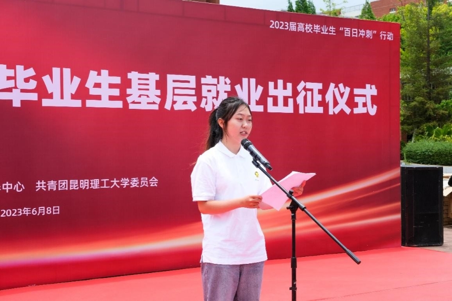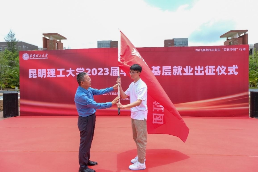出征仪式上,华体会平台党委副书记蔡金红为2023届基层就业学生授旗。华体会平台副校长周峰越向即将走向基层就业岗位的毕业生送去祝福,希望他们对党忠诚、不忘初心、扎根基层,鼓励同学们满怀爱国赤子心,在民族复兴的伟大征程中书写新时代“昆工人”的使命担当。
