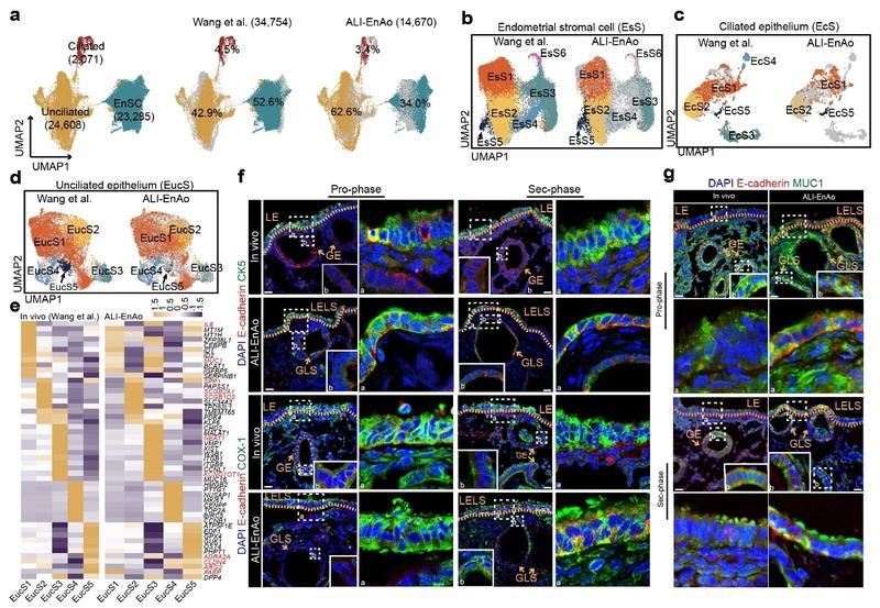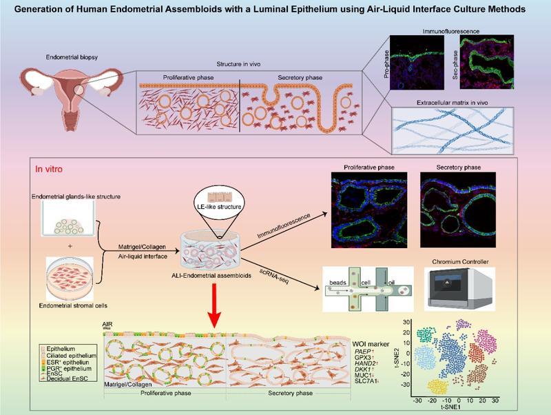 该研究首次构建了一个新的子宫内膜类器官(ALI-EnAo),其具有完整的腔上皮和腺上皮结构。这种类器官将腺上皮和子宫内膜基质细胞结合,并采用改进的细胞外基质和气液界面方法进行培养。通过和体内内膜组织的一系列的比较分析,揭示了子宫内膜类器官能够再现子宫内膜的特征,包括解剖结构、细胞组成、激素诱导的月经周期性变化和基因表达谱。此外,还复制了着床窗和动态纤毛形成的基因表达模式,这对胚胎植入是至关重要的。该模型为深入研究胚胎植入、子宫内膜疾病和再生的机制提供了一个全新平台。