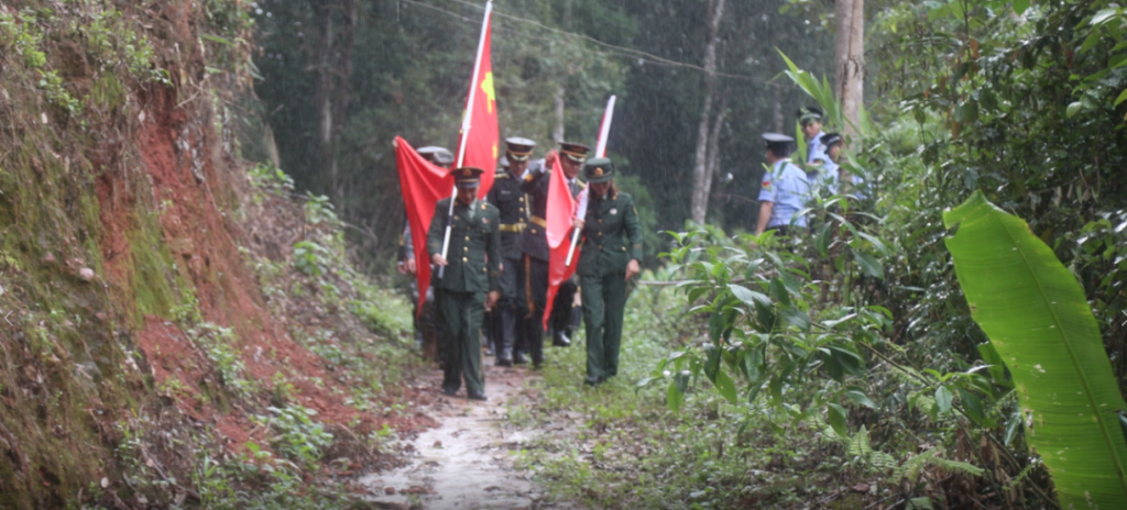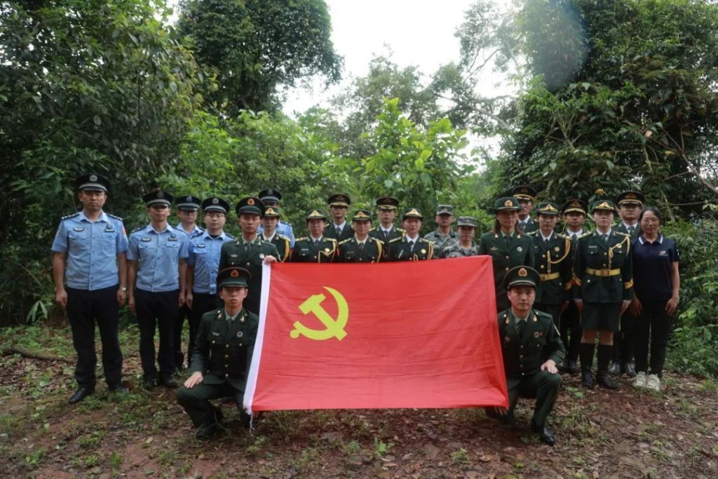 在7号界碑处,勐康出入境边防检查站执勤队况龙斌教导员向大家讲述了界碑的历史意义、边防站的职责使命、榜样的先进事迹等内容,以一场“行走的思政课”为载体,沉浸式启动了深刻的爱国主义教育与精神淬炼。教导员结合当前面临的边境管控复杂态势向大家讲述了强边固防工作的重大意义,并指出国无防不立,民无防不安,国家的昌盛、民族的复兴,离不开强大的全民国防意识。随后,团队成员在国界碑前齐唱《祖国不会忘记》,铿锵旋律响起,整齐歌声激荡,每一句“不需要你认识我,不渴望你知道我”,都是一线边防人扎根一线、默默奉献的真实写照。