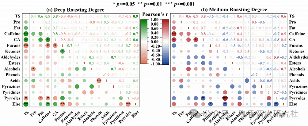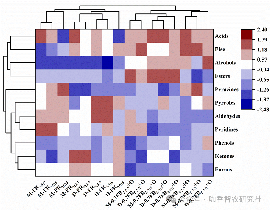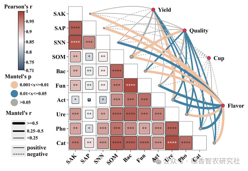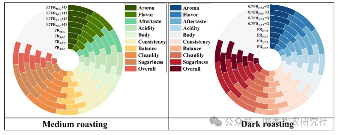 研究结果表明,在果实膨大期增加施肥量可显著提高土壤微生物数量、产量和杯测品质。与FR相比,0.7FR+O使土壤养分综合指数提高21.9%–58.9%,微生物数量增加20.6%–30.4%,酶活性提高14.8%–30.7%,咖啡豆产量提高4.5%–6.1%,营养品质提升8.7%–32.0%。在FR和中度烘焙条件下,特定FR处理的吡嗪、吡咯和醛类含量较高;深度烘焙则增加了吡啶、吡咯和呋喃类化合物。0.7FR5:7:3+O处理的杯测得分最高,为82分。相关性分析显示,土壤微环境因子与产量、品质及风味物质之间存在显著相关(Mantel r>0.5),其中总糖与呋喃类和吡咯类化合物呈显著正相关(Pearson r>0.5)。多层次模糊综合评价结果表明,0.7FR5:7:3+O是改善土壤状况、提高咖啡产量和营养品质的最优策略。本研究为优化西南纵向岭谷地区阿拉比卡咖啡的施肥模式提供了理论依据,旨在防止一次性过量施肥引起的土壤板结,以及单一化学肥施用造成的养分流失。