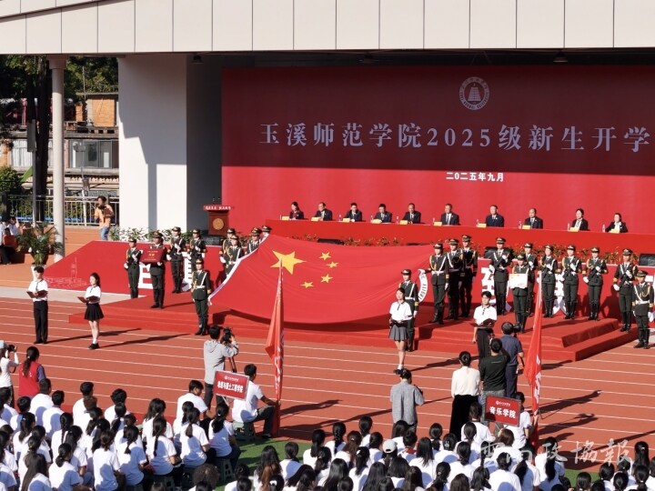 玉溪师范学院在开学思政第一课上,庄重地向全校新生展示了2025年3月获赠2023年5月20日玉溪师范学院建校45周年校庆日在北京天安门广场升挂的国旗,伴随雄壮的国歌声,全体新生向国旗致敬,以庄重仪式感厚植“强国有我”的赤子之心。