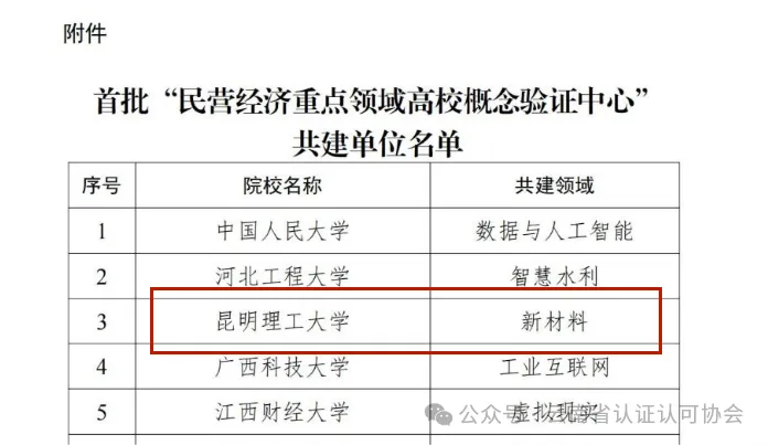 近日,全国工商联人才交流服务中心与中国民营科技促进会联合发布《关于征集“民营经济重点领域高校概念验证中心”共建单位的通知》(全联人才〔2025〕3号)。由华体会平台、云南省认证认可协会及云南大泽电极科技股份有限公司、成都纳尔美环境能源技术有限公司、云南伟通易达科技有限公司、云南安权霄防新型材料有限公司、广西天丞铝业有限公司、云南前海高新技术产业研究院有限公司6家民营企业共同申报的“新材料”领域概念验证中心成功入选首批25家共建单位,成为云南省唯一获批共建单位,标志着我省在推动产学研用深度融合方面迈出关键一步。