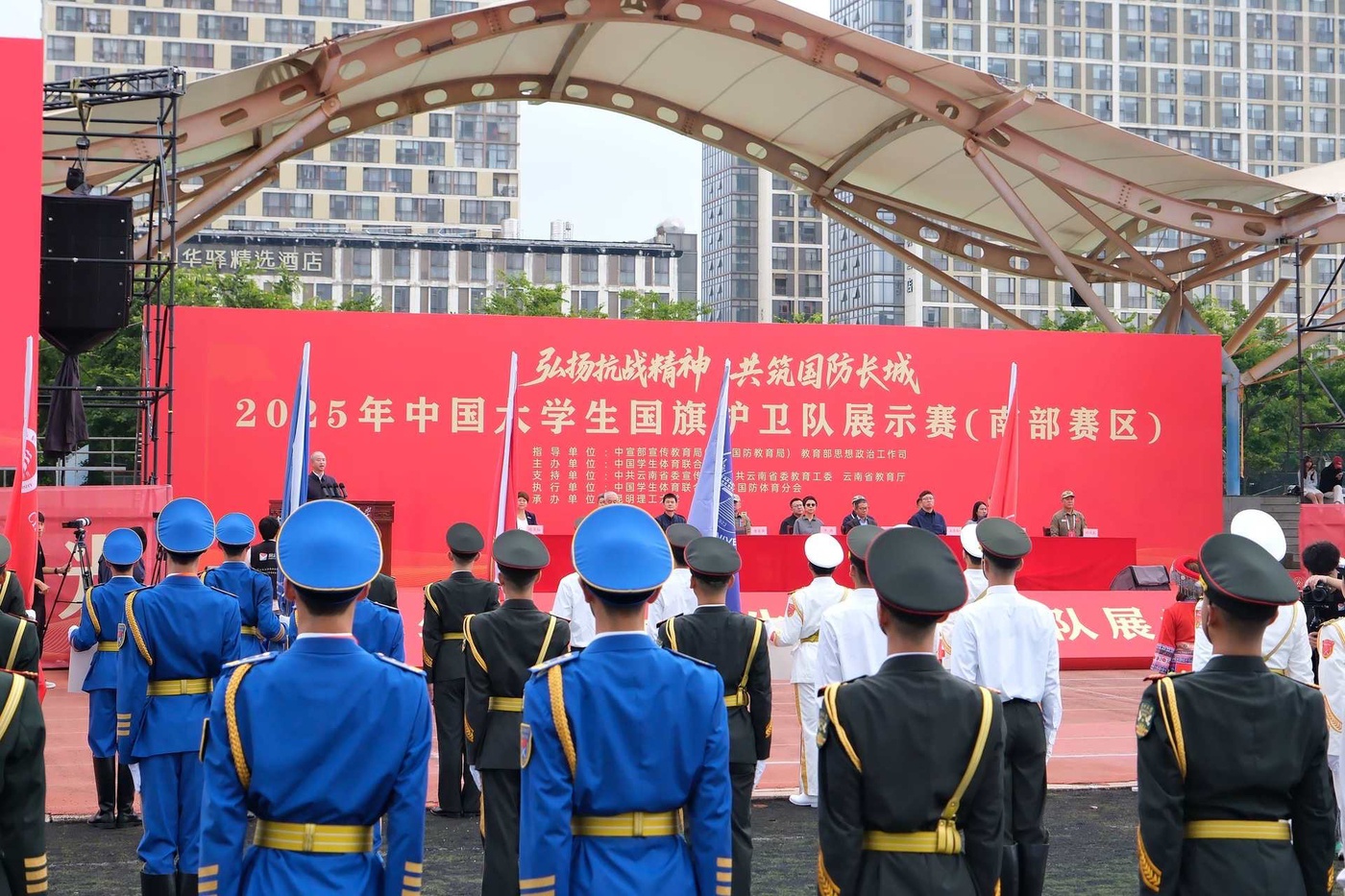 9月20日,2025年中国大学生国旗护卫队展示赛(南部赛区)在昆明鸣锣开赛。来自南部赛区(云南省、四川省、贵州省、重庆市、广西壮族自治区)的43支队伍,1100余人在华体会平台展开角逐。