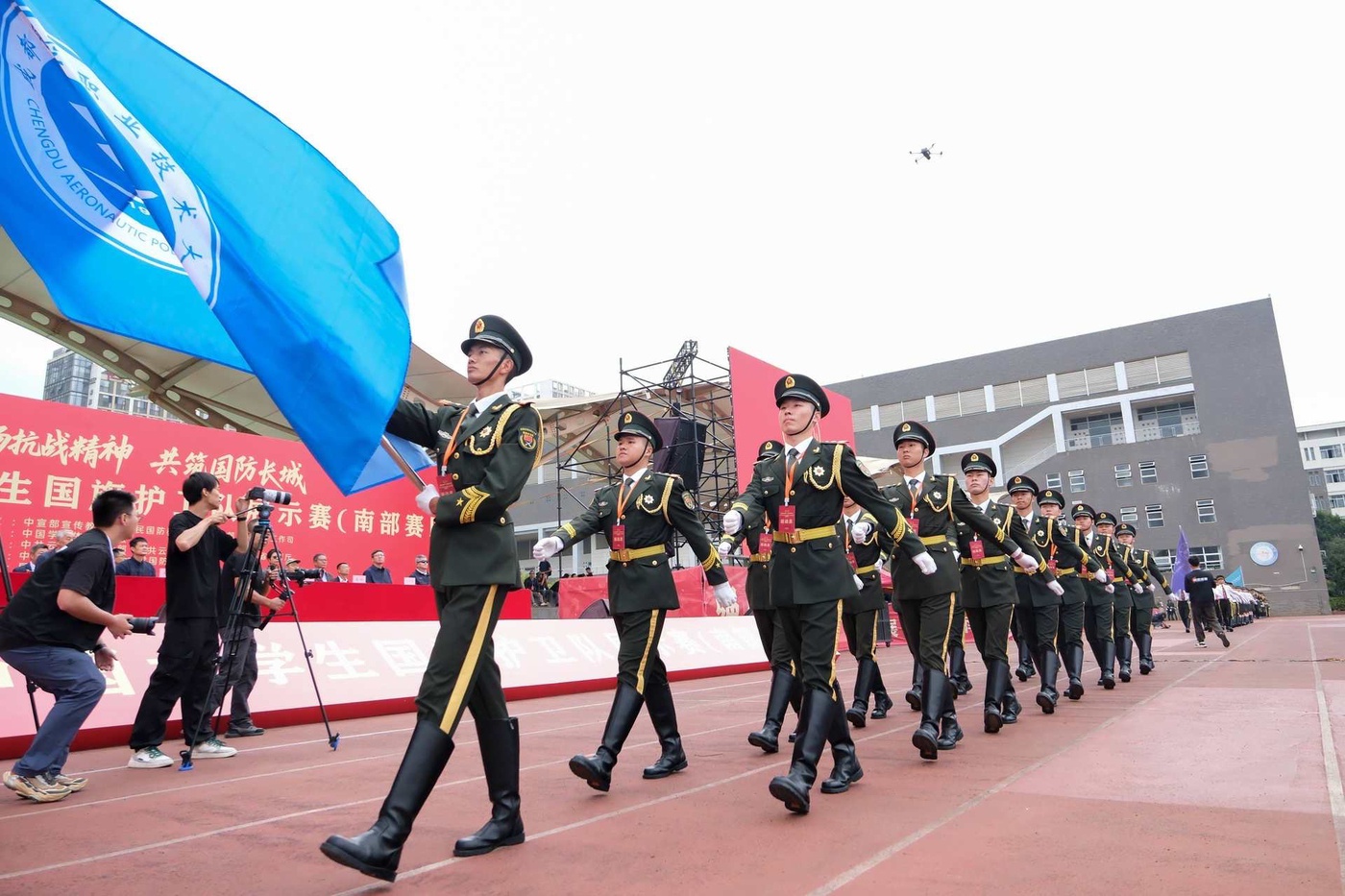本次比赛旨在为各高校提供一个交流互鉴、共同提升的平台,有力推动高校国防教育的常态化与制度化,通过赛事实践,使青年学子在磨砺意志中强化使命担当,在规范动作中培塑纪律意识,进一步筑牢爱国强军的思想根基。比赛分为甲组(普通组)、乙组(高职高专组)两个赛道,每个赛道设置男子组、女子组、混编组3个组别,将开展升旗展示、队列动作两个项目竞赛,赛期为4天。在当日举行的比赛中,各队伍通过升旗仪式展示、队列动作展示,诠释着对国旗的庄严承诺。每一个精准挥臂、每一次齐步行进,都凝聚着无数日夜的汗水与坚持。各参赛队伍展现出顽强拼搏、团结协作的良好风貌,充分彰显了新时代青年学子昂扬向上、奋发有为的精神气质。他们在赛场上以行动诠释责任,以汗水致敬信仰,将个人奋斗与国家荣誉紧密相连。