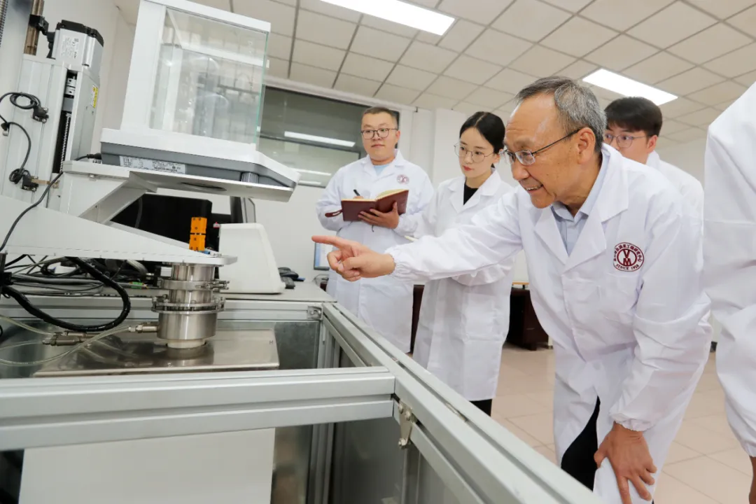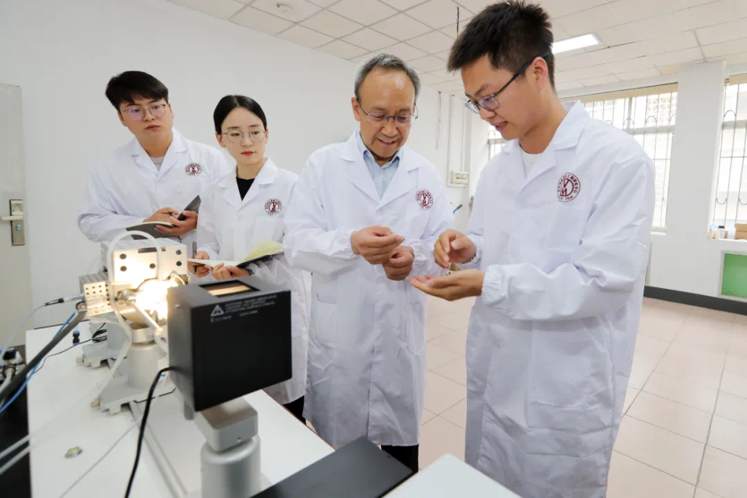 杨斌(右二)带领学生利用熔体物性测定仪进行熔体物性检测。(郝亚鑫 摄)