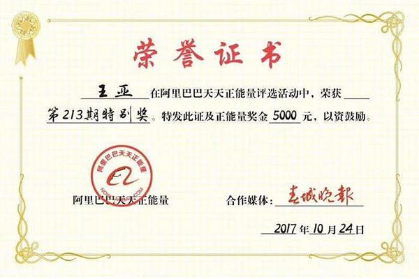 王亚的行为感动了不少人,阿里巴巴天天正能量还因此授予王亚阿里巴巴天天正能量第213期特别奖,颁发奖金5000元给王亚。