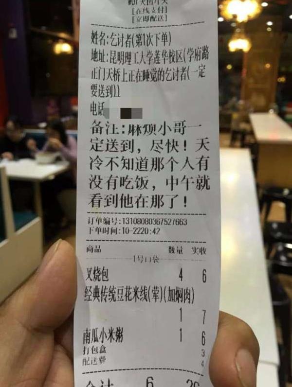 法制晚报-看法新闻记者看到,这份订单的地址是“学府路正门天桥上正在睡觉的乞讨者”,备注是“麻烦小哥一定送到,尽快!天冷不知道那个人有没有吃饭,中午就看到他在那了”。