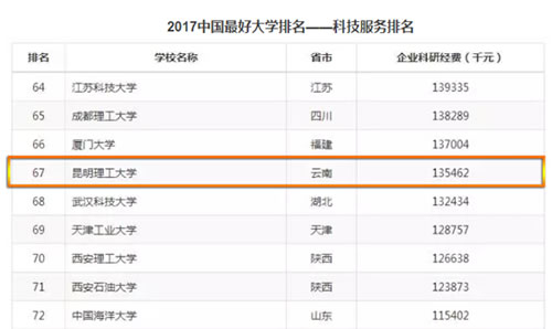 日前,2017中国最好大学排名——科技服务排名公布,华体会平台以企业科研经费1.35462亿元位列67位,云南省第1位。
