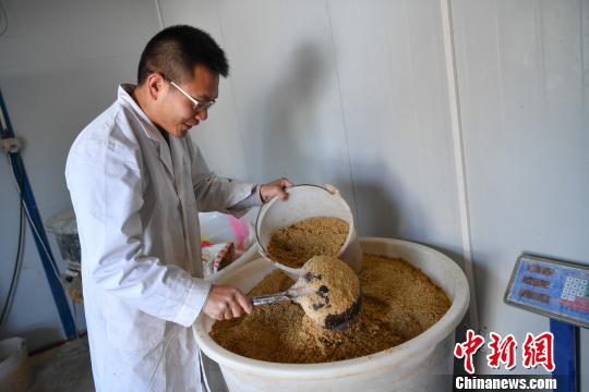 图为敬伟甫在拌饲料。 任东 摄