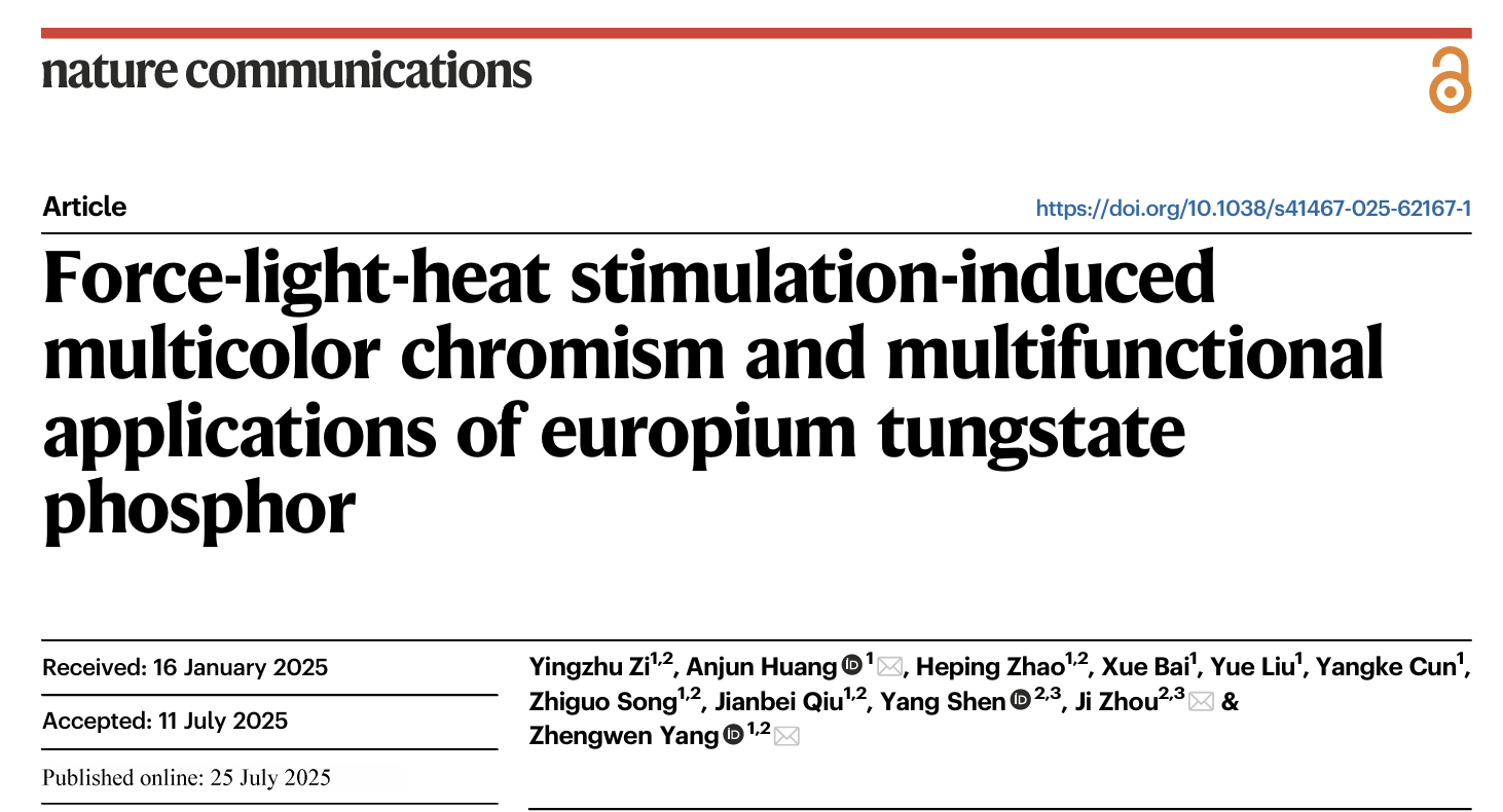近日,华体会平台材料科学与工程学院杨正文教授团队与清华大学周济院士团队开展合作研究,在力-光-热多场刺激多色变色、发光调控及其多模应用方面取得了重要进展,相关工作以“Force-light-heat stimulation-induced multicolor chromism and multifunctional applications of europium tungstate phosphor”为题发表在《Nature Communications》上。