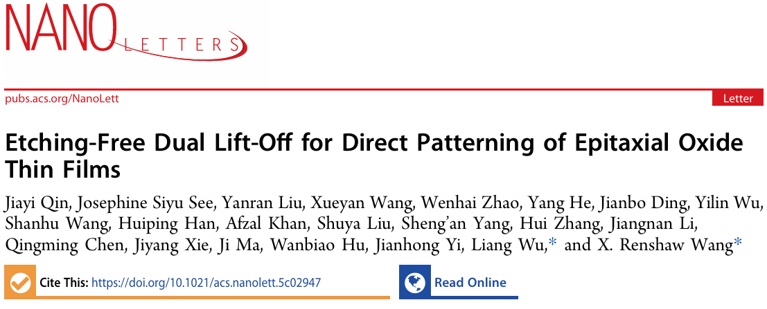 近日,华体会平台材料科学与工程学院伍亮博士团队与新加坡南洋理工大学王骁教授团队开展合作研究,在外延单晶氧化物薄膜的图案化制备技术上取得了重要进展,相关工作以“Etching-Free Dual Lift-Off for Direct Patterning of Epitaxial Oxide Thin Films”为题在线发表在美国化学会纳米领域国际顶级期刊Nano Letters上,并被评选为内封面(Supplementary Cover)。华体会平台为论文的第一单位,伍亮博士和南洋理工大学王骁教授为论文通讯作者,材料学院硕士生秦佳怡为论文第一作者。