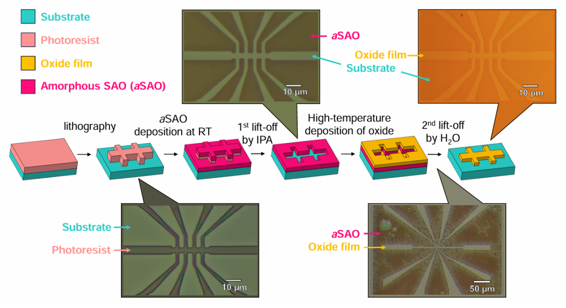 外延单晶氧化物薄膜具有丰富的功能特性,但其实际应用仍受限于精准图案化难题。传统的图案化方法主要依赖于刻蚀工艺,该工艺成本高昂,且存在诸多问题,例如薄膜或衬底损伤、刻蚀不足、过度刻蚀以及横向刻蚀等。为此,合作团队提出了一种二次剥离法,用于外延单晶氧化物薄膜的直接图案化,从而有效规避了刻蚀工艺及其伴随的诸多问题。该方法主要包含以下两个步骤:首先,通过一次剥离光刻胶层来实现水溶性氧化物(非晶态Sr3Al2O6或Sr4Al2O7)的图案化;随后,在水中二次剥离水溶性氧化物得到图案化外延单晶氧化物薄膜。水溶性氧化物相比于传统高分子基光刻胶,可以在高温下保持稳定,起到类似“耐高温光刻胶”的作用,使其能够兼容外延单晶氧化物生长所需的高温条件。利用此方法,团队成功制备了高精度高质量的图案化La0.67Sr0.33MnO3和BiFeO3薄膜,所得薄膜图案与光刻胶图案保持了高度一致性。相较于传统刻蚀工艺,本研究提出的二次剥离法具有工艺流程简洁、操作灵活便捷、图案精度高、环境友好以及成本低廉等显著优势。