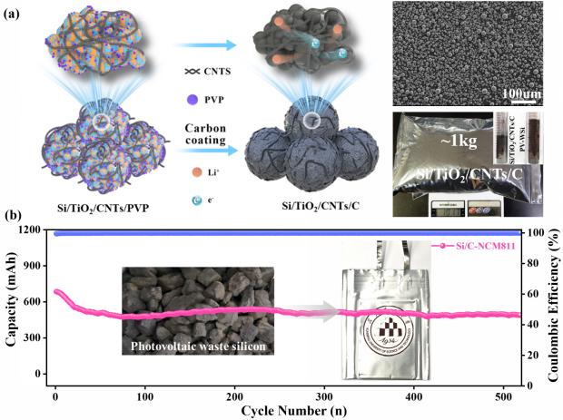 蓬勃发展的光伏产业带来大量的硅切割废料,不当处置不仅可能带来巨大的资源浪费,还会增加严重的环境负担。针对硅切割废料的高效增值回用难题,华体会平台硅冶金与硅材料团队提出借助光伏硅切割废料独特二维结构特征,制备高性能硅基负极材料。通过砂磨构建起硅与二氧化钛(TiO2)的强界面耦合,借助刚性相界面粘附与载荷分担协同缓解体积变化,实现了高性能硅基复合材料的制备,所得Si/TiO2/CNTs/C复合材料振实密度达到 0.9 g·cm-3,组装的软包全电池能量密度达到 320 Wh·kg-1,并保持了优异的循环性能和倍率性能。研究团队在实验室实现了公斤级高性能硅基复合材料的制备,为光伏硅切割废料高值回用制备高性能硅基负极的可行性提供了新路径。、