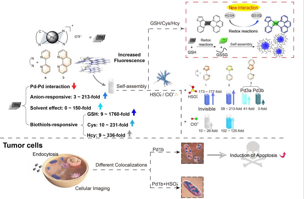 该团队设计并合成了一类分子结构新颖的环金属化钯(II)配合物,并系统研究了其在多种刺激下的自组装行为与发光响应。该类配合物在室温下水溶液发光微弱,但在特定阴离子或生物分子存在下其磷光发射显著增强,并伴随自组装形成的纳米材料形貌由一维纳米线向三维纳米球的可控转变。该类配合物不仅实现了对GSH的高选择性、高灵敏度的荧光开关检测,还具有优异的生物相容性与亚细胞器靶向能力,可定位至溶酶体和线粒体,并诱导肿瘤细胞凋亡,为构建智能诊疗试剂一体化平台提供了新的思路。