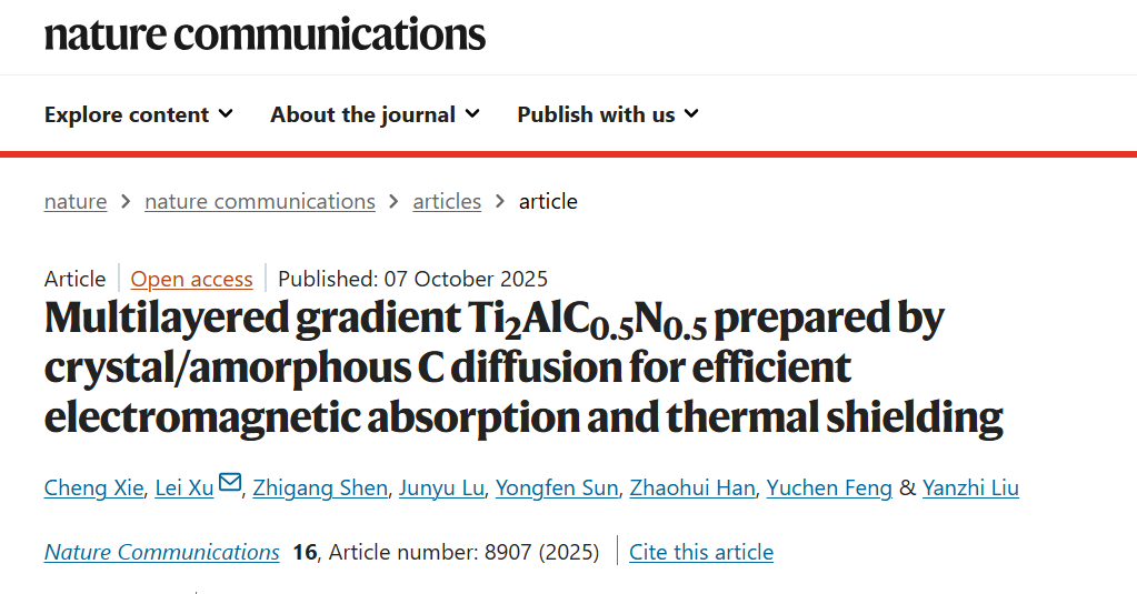 日前,华体会平台冶金与能源工程学院许磊教授团队在微波能冶金应用方面研究取得新进展,相关成果以Multilayered gradient Ti2AlC0.5N0.5 prepared by crystal/amorphous C diffusion for efficient electromagnetic absorption and thermal shielding为题,发表在学术期刊Nature communications上。
