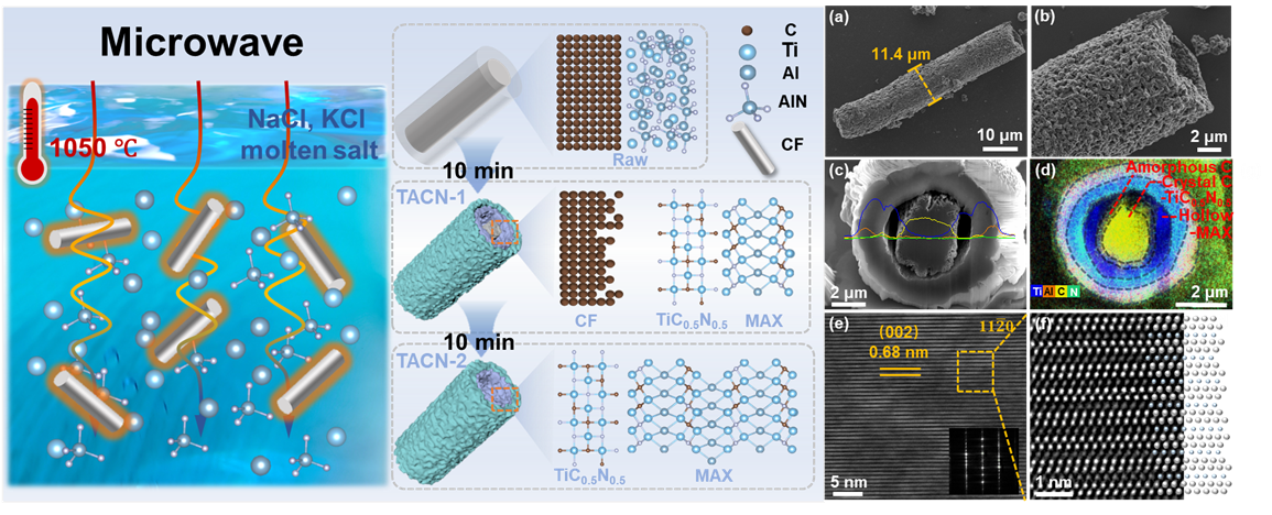 电磁场与物质作用的能量损耗和转化是微波冶金应用基础研究的重要领域。金属碳化物在微波吸收转化方面具有优异性能,MAX相具有结构成分可调、高稳定性及良好的导电性等特征,通过构建异质界面,可显著提升物料与微波电磁场的阻抗匹配。许磊教授研究团队报道了一种基于表面/界面工程的微波熔盐碳扩散控制合成策略。该方法利用微波与熔盐的协同效应,选择性穿透加热实现碳纤维表面局域过热,增强熔盐条件下碳材料表面非晶化转变与碳扩散,形成多层梯度核壳金属碳化物结构,并实现与微波的高阻抗匹配及能量损耗。该方法为金属碳化物微波高效制备及能量转化机制等研究提供了新途径,在冶金、材料、能源及化工领域具有广泛应用前景。
