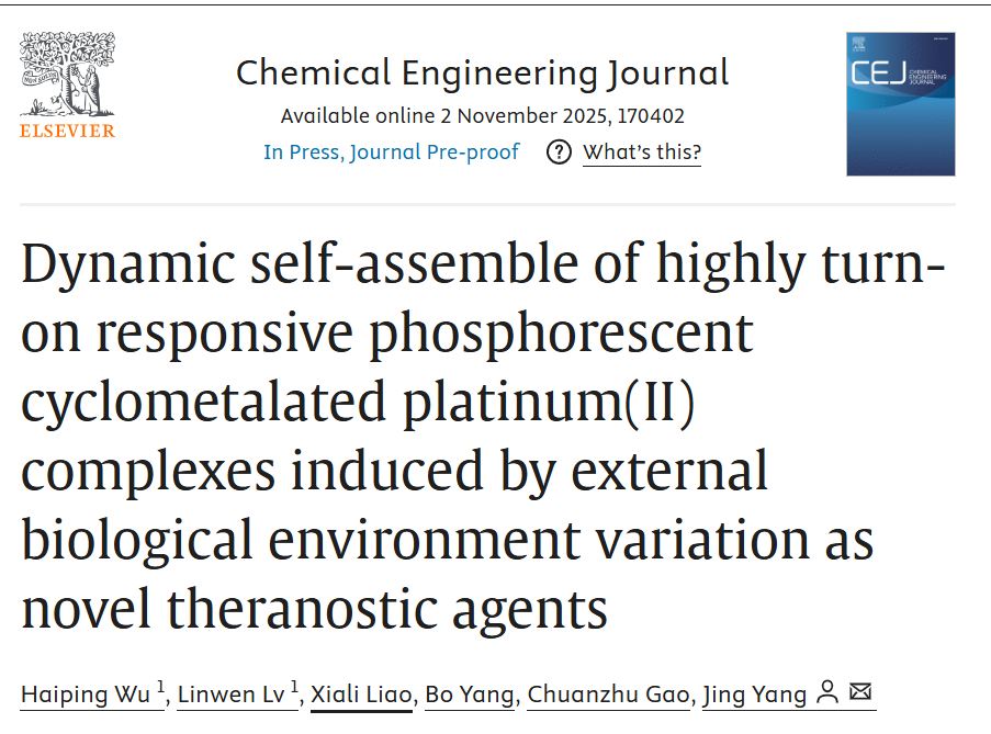 近日,生命科学与技术学院超分子药物化学课题组在生物环境诱导动态自组装的开启型响应环金属化铂(II)配合物作为新型治疗诊断剂的领域取得新进展。相关研究成果以“Dynamic self-assemble of highly turn-on responsive phosphorescent cyclometalated platinum(II) complexes induced by external biological environment variation as novel theranostic agents”为题发表在国际著名化工领域期刊《Chemical Engineering Journal》上。