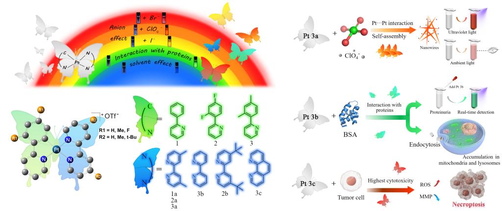 超分子药物化学课题组合理设计和合成了一系列多功能环境响应发射环金属化铂(II)配合物,随着外部环境的变化,这些配合物表现出有效的阴离子诱导的动态自组装行为,并形成橙色、红色或深红色发光线性纳米结构。如图所示,其中以2-(2,4-二甲基苯基)吡啶为C^N配体的系列3个配合物均表现出较好的性能,Pt3a在阴离子诱导的深红色发射中表现出最高的增强,而Pt3b在水溶液中表现出最强的与蛋白质(如BSA和HSA)的结合亲和力,其开启绿色磷光发射可应用于糖尿病患者的蛋白尿检测。Pt3c在阴离子或蛋白质诱导的磷光增强程度最低,在HeLa中表现出最高的细胞毒性和诱导坏死性凋亡。该研究为构建应用于治疗诊断平台的多功能纳米材料提供了有效的思路与方法。