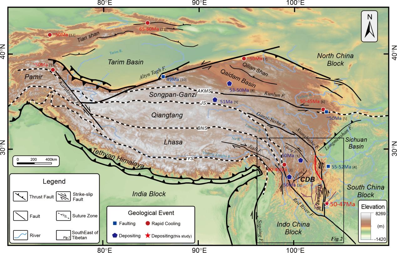 研究证实,陆南和弥勒盆地所记录的小江断裂逆冲活动,与印度–亚洲碰撞的初始阶段呈现出准同步特征。作为鲜水河–则木河断裂体系的重要组成部分,小江断裂的这次早新生代逆冲活动,与雷波断裂、丽江断裂等同期的构造响应保持一致。这反映了碰撞引发的构造应力已同步传递至青藏高原东南缘远场区域,而稳定地块的刚性传导作用,为这种长距离的应力传递提供了必要条件。